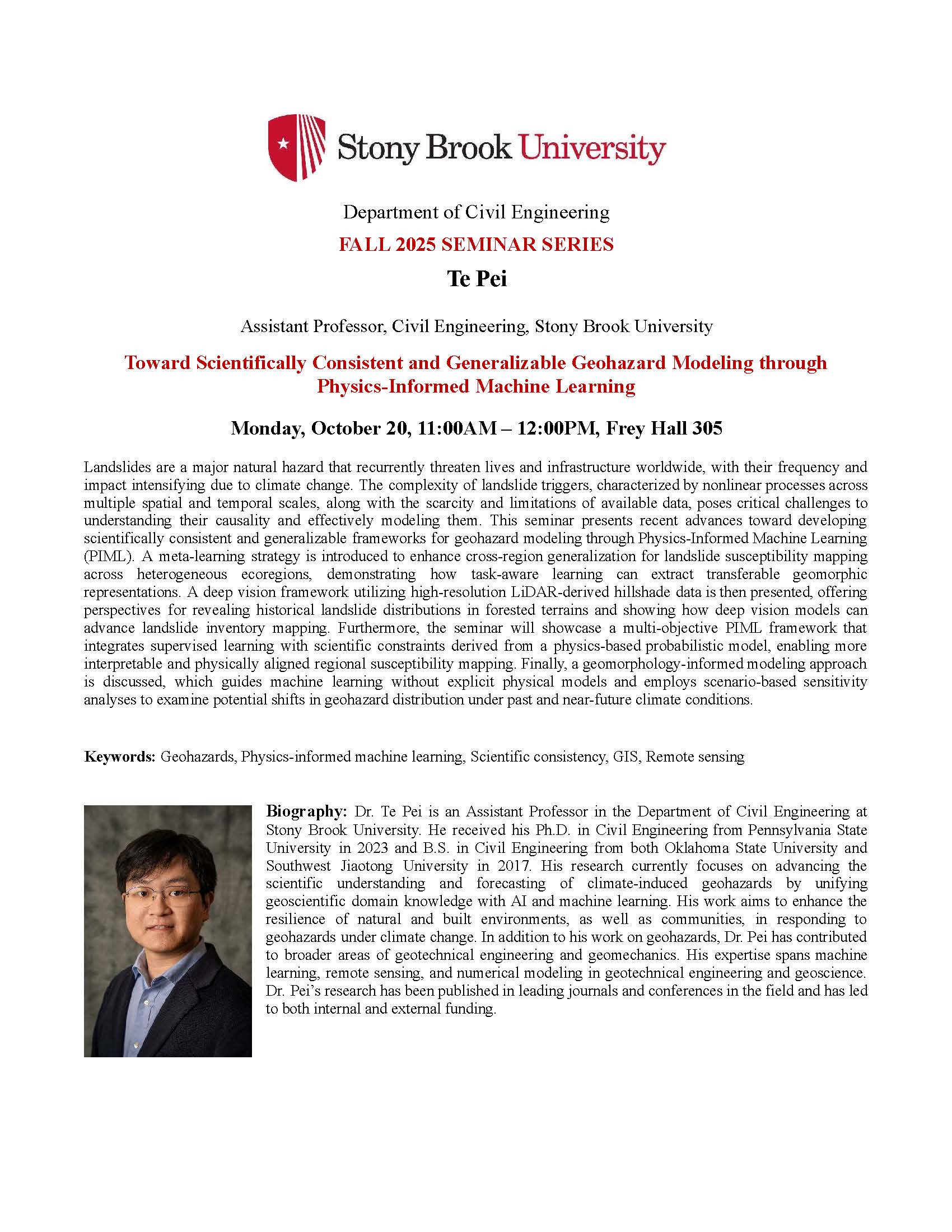 "Toward Scientifically Consistent and Generalizable Geohazard Modeling through Physics-Informed Machine Learning", Te Pei, PhD